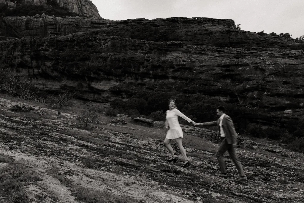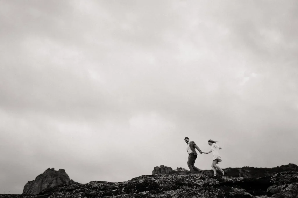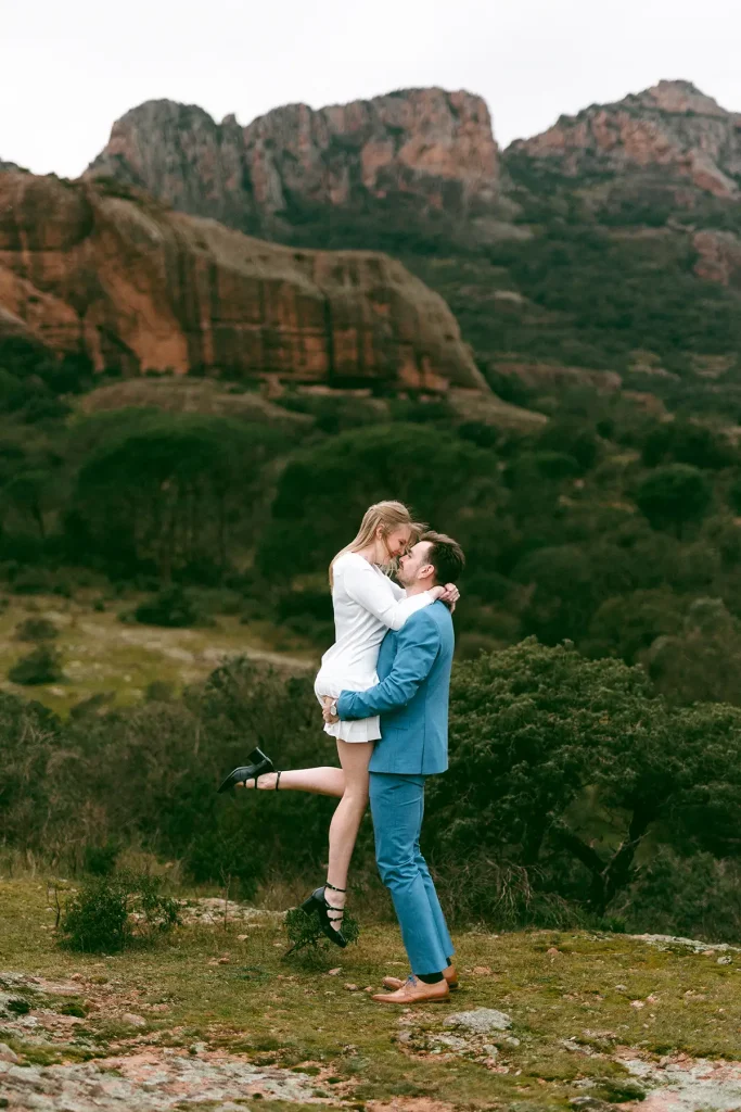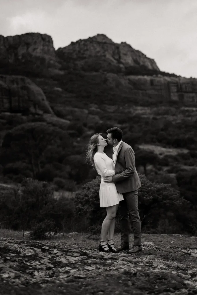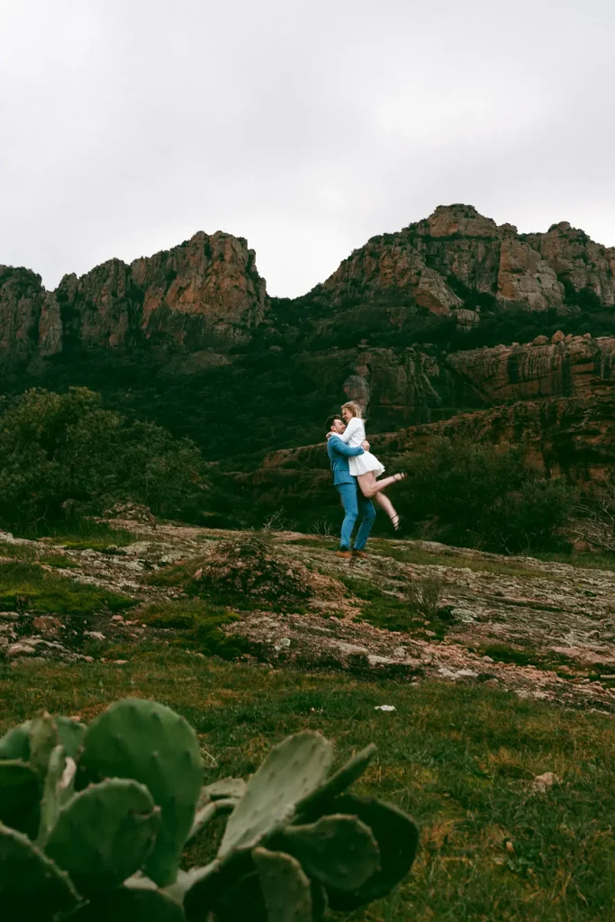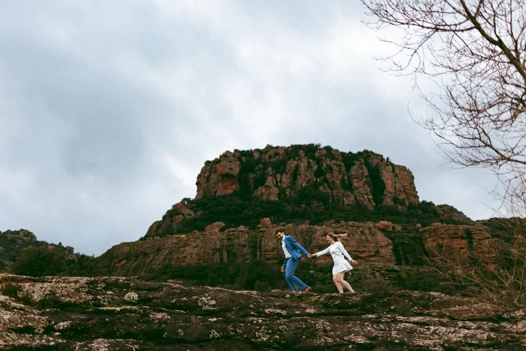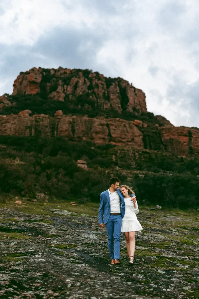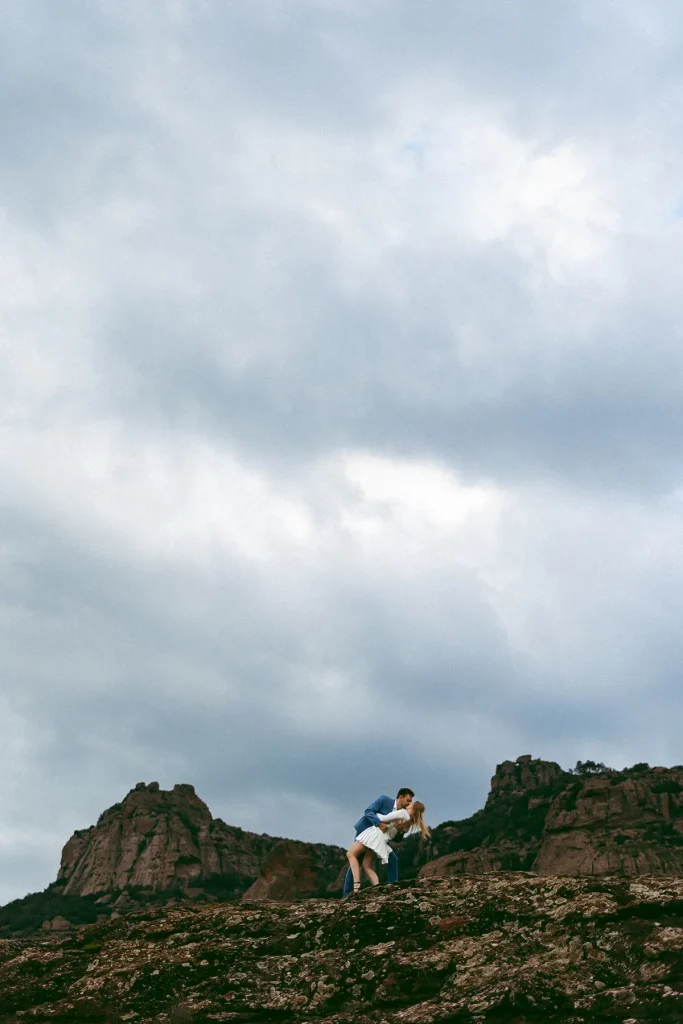 J’avais longtemps rêvé de réaliser une séance d’engagement au Rocher de Roquebrune. C’est un lieu emblématique du Var à la beauté brute. Ce paysage spectaculaire est marqué par la roche rouge typique du massif. Difficile de le manquer, ce rocher, on le voit de loin. Si c’est habituellement plutôt un lieu de randonnée, j’avais très envie de réaliser des photos de couple dans ce décor. Ce jour là, la météo, au mois de mars, était très instable. Finalement, c’est ce qui a donné cette atmosphère un peu dramatique et surtout poétique que j’ai fait en sorte de retranscrire dans mes photos. J’ai trouvé que ce décor naturel était parfait pour des photos fortes visuellement.