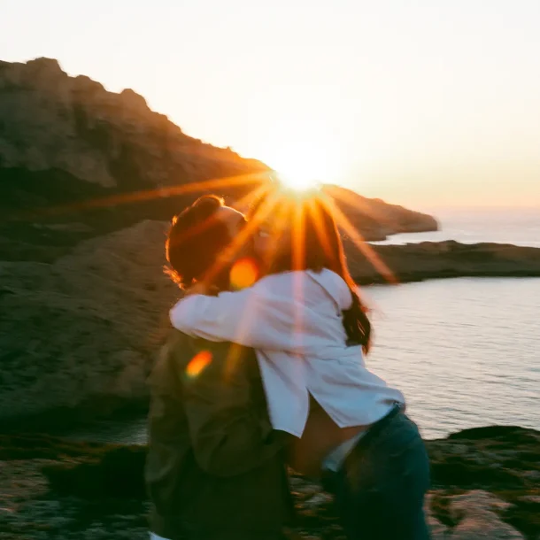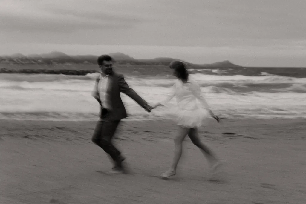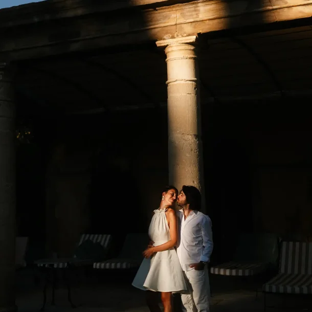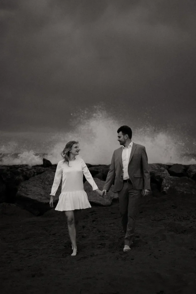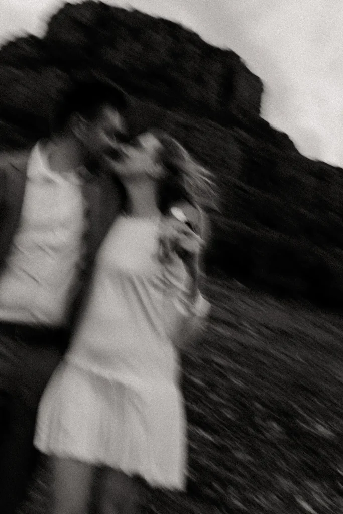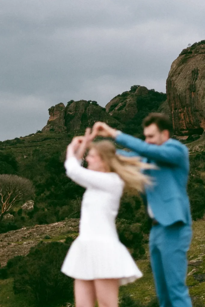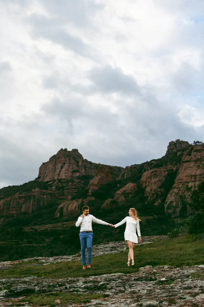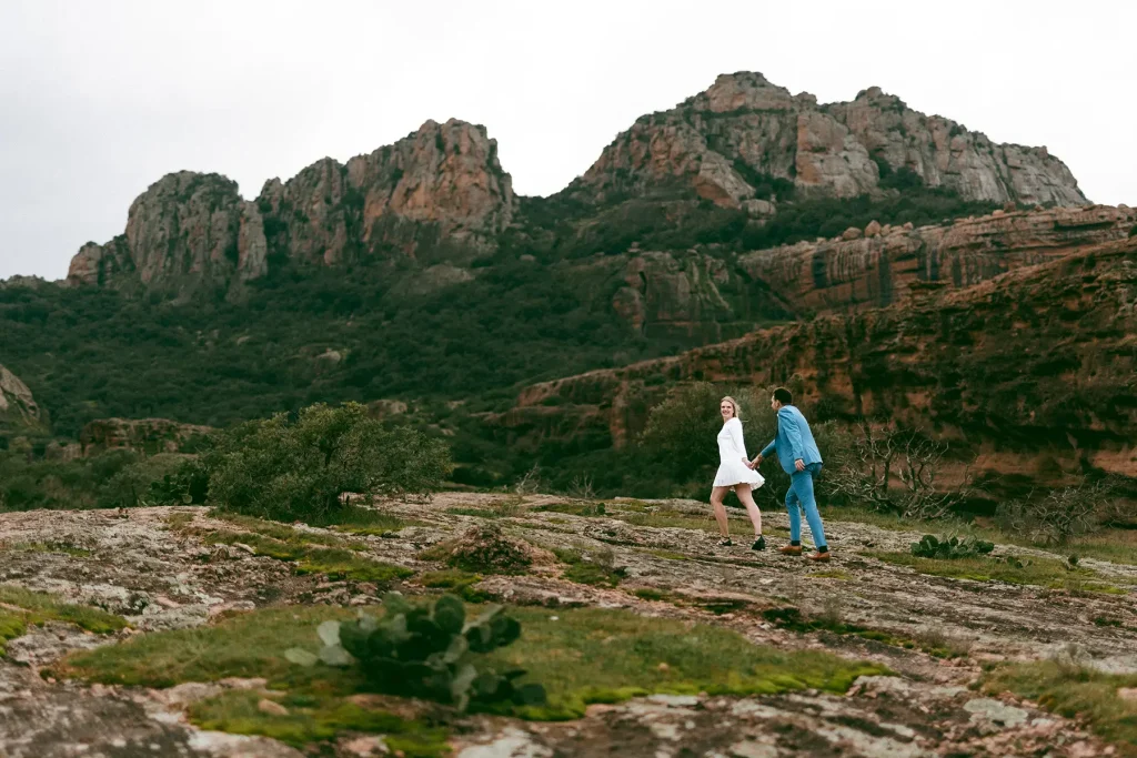 J’avais longtemps rêvé de réaliser une séance d’engagement au Rocher de Roquebrune. C’est un lieu emblématique du Var à la beauté brute. Ce paysage spectaculaire est marqué par la roche rouge typique du massif. Difficile de le manquer, ce rocher, on le voit de loin. Si c’est habituellement plutôt un lieu de randonnée, j’avais très envie de réaliser des photos de couple dans ce décor. Ce jour là, la météo, au mois de mars, était très instable. Finalement, c’est ce qui a donné cette atmosphère un peu dramatique et surtout poétique que j’ai fait en sorte de retranscrire dans mes photos. J’ai trouvé que ce décor naturel était parfait pour des photos fortes visuellement.
