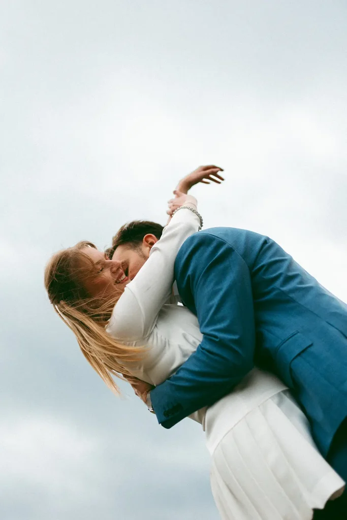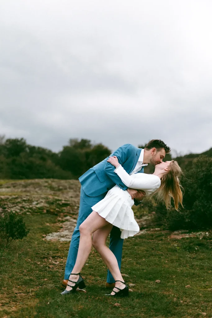Ce couple courageux était prêt à braver les éléments pour créer à mes côtés des images uniques. Parfois, une séance d’engagement au Rocher de Roquebrune ce n’est pas seulement s’habituer à l’objectif, c’est aussi prendre un moment, juste avant le mariage, pour créer des souvenirs hors du commun. Avec moi comme photographe de mariage, tout est permis et franchement, je vous suis volontiers dans vos idées mêmes les plus originales ! Aussi, lors de shooting de couple, le contraste entre les tenues élégantes de leur civil et le paysage sauvage a contribué à créer des images si esthétiques. La lumière était incroyable malgré le temps (on avait même eu quelques éclaircies). Finalement, le rocher de Roquebrune est l’un des paysages les plus impressionnants du Var pour une séance photo de couple cinématographique.