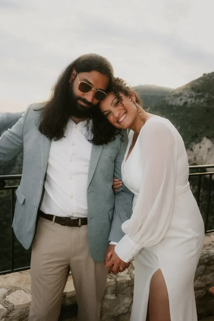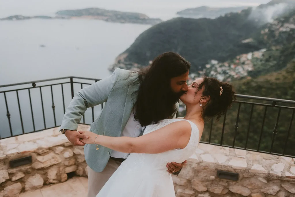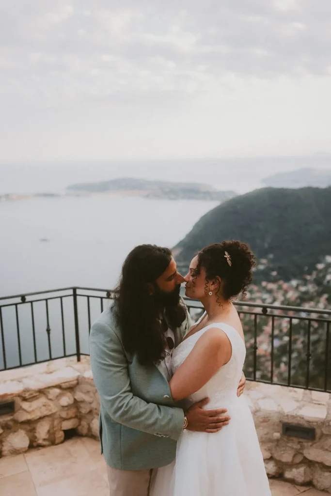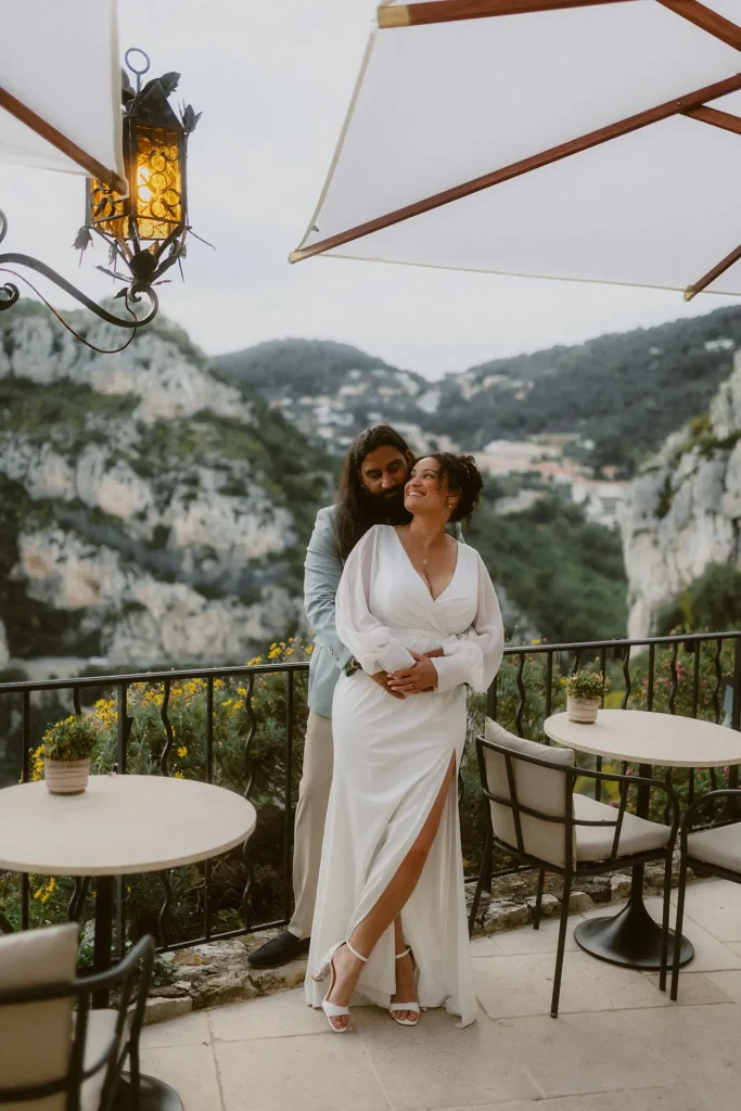 Ce couple sud-américain et indien réside au Canada. Ils ont choisi de s’enfuir sur la French Riviera, le temps de leur élopement à Eze. Leur programme ? Un savant mélange d’hotel de luxe, de dîner étoilé et de road-trip sur les petites routes de la Côte d’aAzur ! C’est a Eze qu’ils logeaient, dans la suite panoramique de l’hotel Eza. Je les y ai rejoins pour quelques photos de leurs préparatifs, en toute détente, dans cette incroyable suite. Puis, nous avons déambulé dans les superbes petites ruelles du village pour quelques photos de couple. De retour à l’hotel, il était l’heure de leur cérémonie informelle. Ce couple avait imaginé un émouvant échange de voeux sur la terrasse panoramique de l’hotel Eza, avec une vue sur la baie de Beaulieu. Pour finir, je les ai accompagnés pour immortaliser un dîner en tête à tête dans le restaurant étoilé de l’hotel, avec balcon privatisé, le regarde posé sur cette étendue d’Azur.