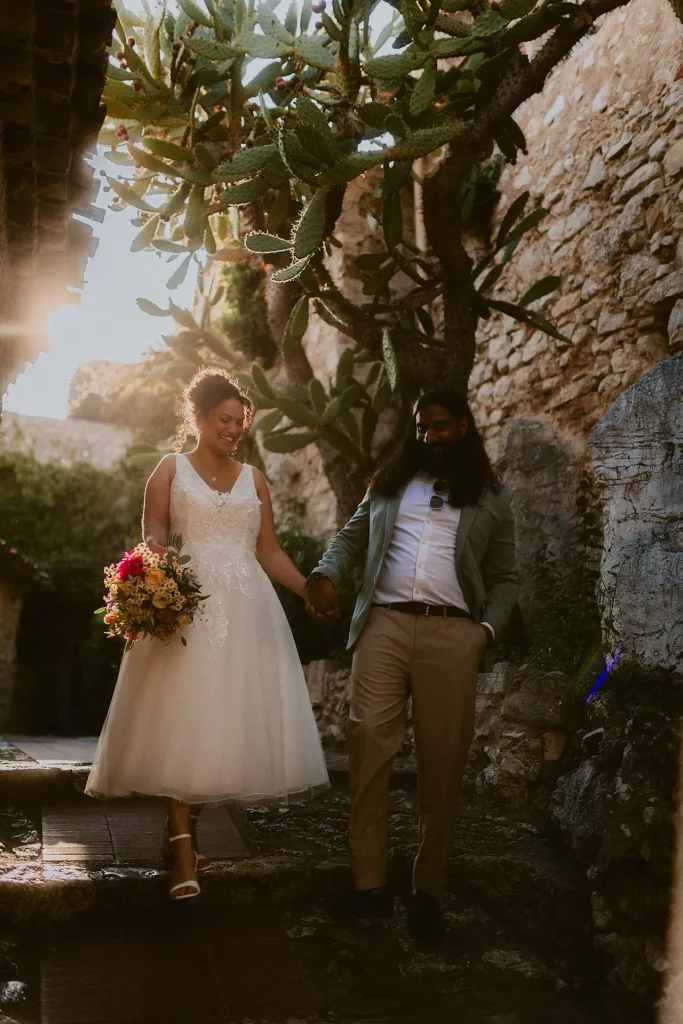 Eze, c’est un petit village médiéval, au charme provençal. Des ruelles étroites et pavées qui se perdent à l’infini, des façades colorées et des plantes exotiques à chaque coin de rue : c’est la destination idéale pour un élopement à Eze. A quelques minutes de Nice, ce village perché offre une vue à couper le souffle sur la baie de Monaco. On aperçoit non loin la presqu’ile de Saint-Jean-Cap-Ferrat et Villefranche-sur mer. Existe-t’il une meilleure destination pour s’unir en toute intimité ou pour célébrer son mariage sur le côté d’Azur ? En tant que photographe de mariage sur la French Riviera, j’ai un amour particulier pour photographier des mariages sur la Côte-d’Azur. Le soleil y brille différemment et même quand il ne fait pas beau (ce qui est rare), la lumière est belle !