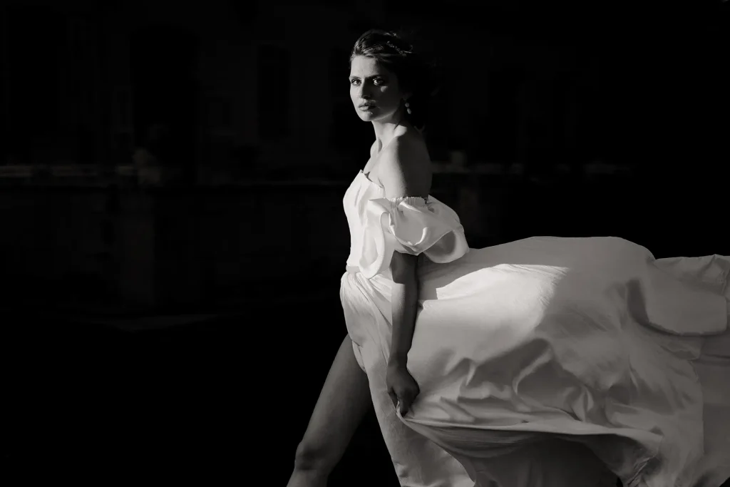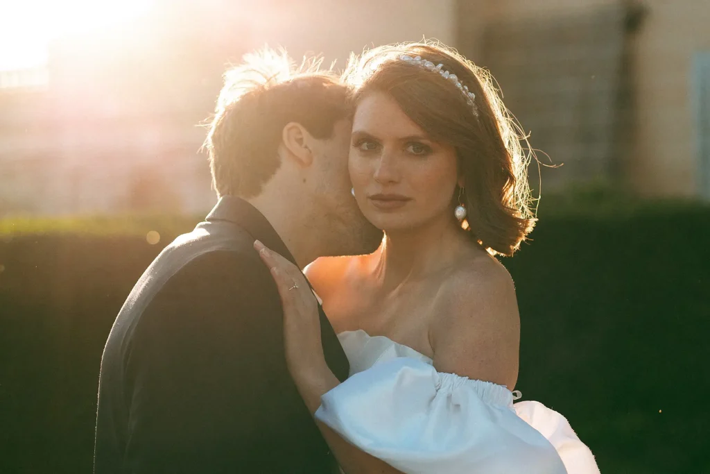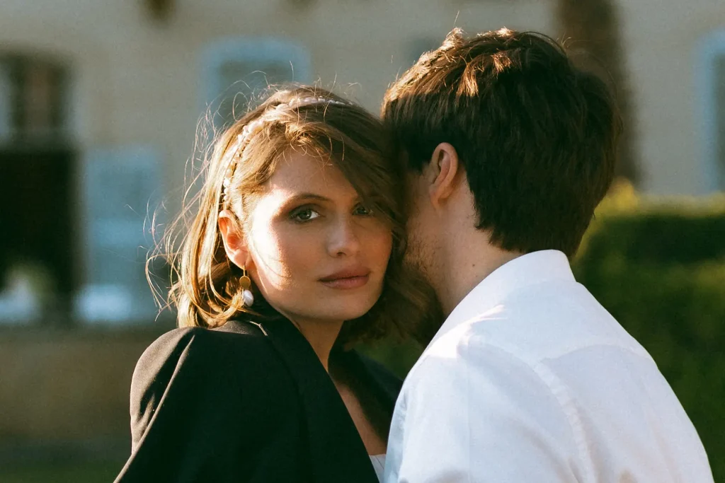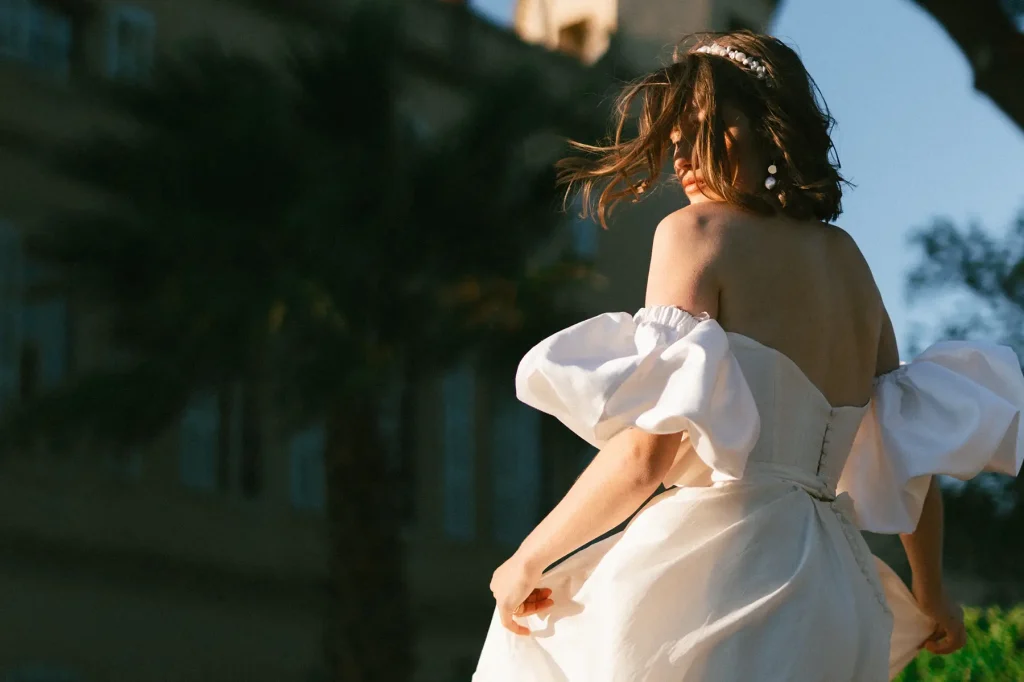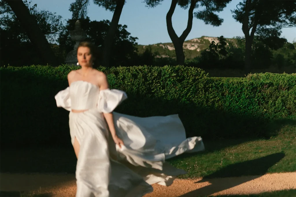 Le mistral, qui soufflait ce jour-là “à décorner les taureaux”, comme on dit en Provence, a ajouté une dimension inattendue mais incroyablement puissante à ce shooting inspiration mariage edito au Chateau de Sénéguier.. S’adapter aux éléments, c’est le cœur du métier de photographe, et nous avons fait le choix d’en tirer parti ce jour-là.