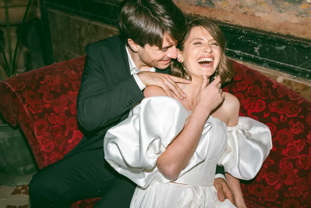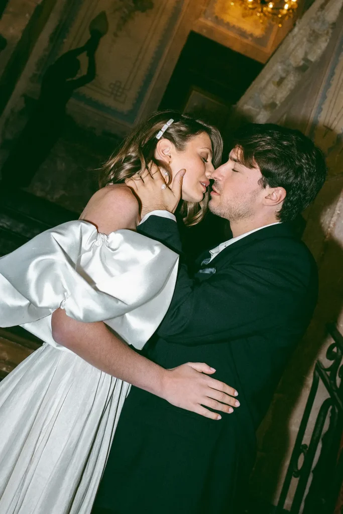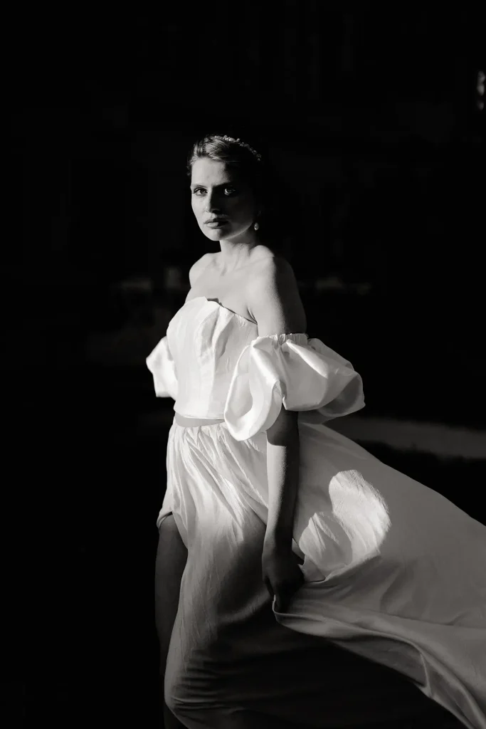 Tout n’était que dualité : un vent libre et impétueux face à l’immuabilité des vieilles pierres ; le mouvement, presque la désinvolture, des jeunes mariés contrastant avec les tapisseries d’époque ; le minimalisme assumé de la scénographie s’opposant à la puissance sculpturale de la robe Alma Réal, dont le volume semblait répondre aux bourrasques du vent dans un mouvement omniprésent.
