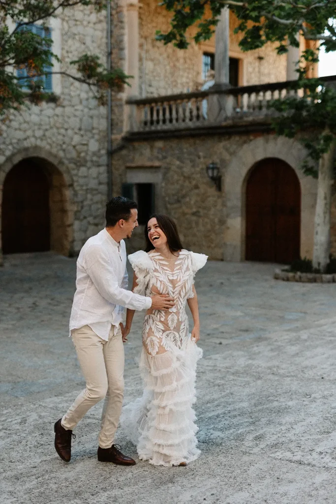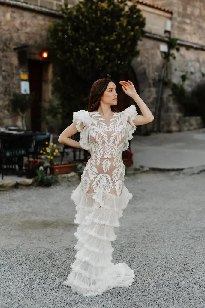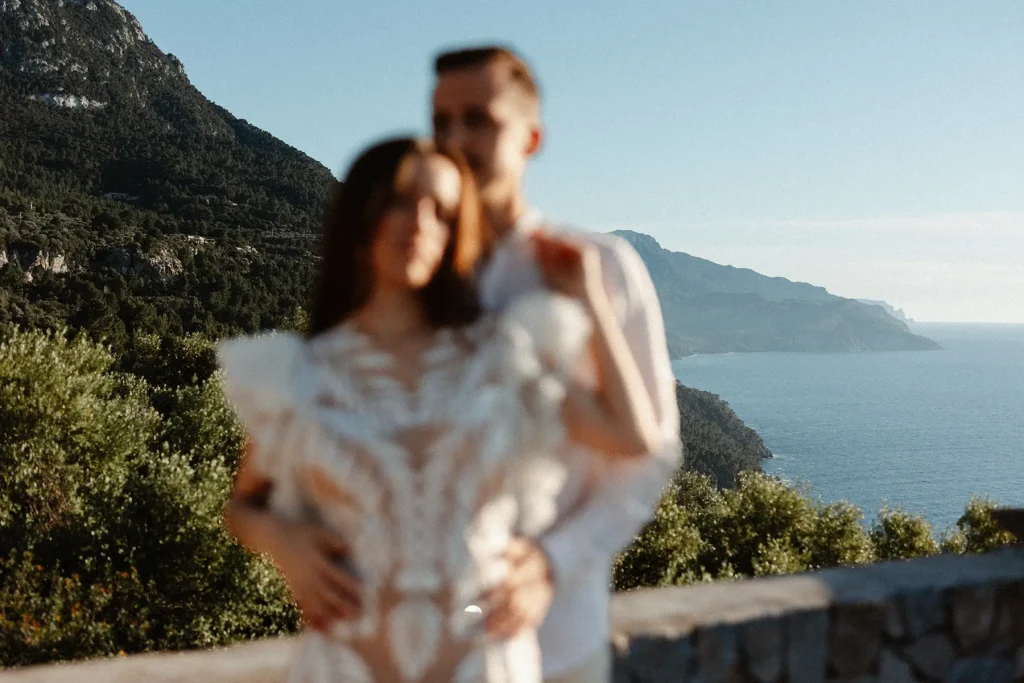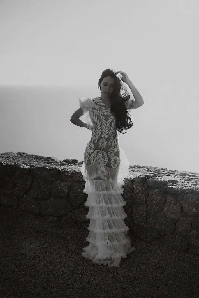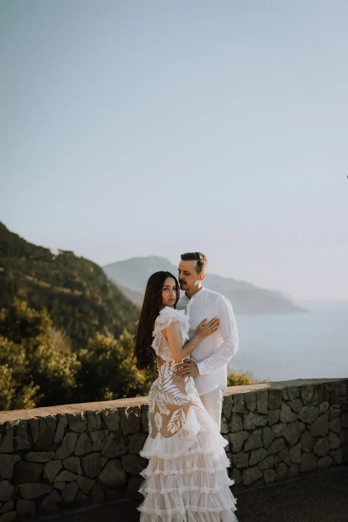 Mes grands-parents étaient de Palma, à Majorque. C’est peut-être ce qui a influencé mon amour pour cette île méditerranéenne si solaire. Mais si la plupart des touristes s’orientent vers la côte Est, rien n’a d’égal à mon sens que la côte ouest sauvage et préservée. Pour ce shooting inspiration mariage à Majorque, j’ai choisi de mettre en avant les paysages sauvages de la Serra de la Tramuntana. Ce littoral est baigné d’une lumière méditerranéenne intense et c’est ce que j’ai délibérément utilisé pour créer des photos pleines de vie et de moments hors du temps. Pour cette inspiration mariage, Alma Réal a crée une robe fortement inspirée de l’esthétique espagnole tout en jouant sur la transparence et la légèreté des volumes et des matières.