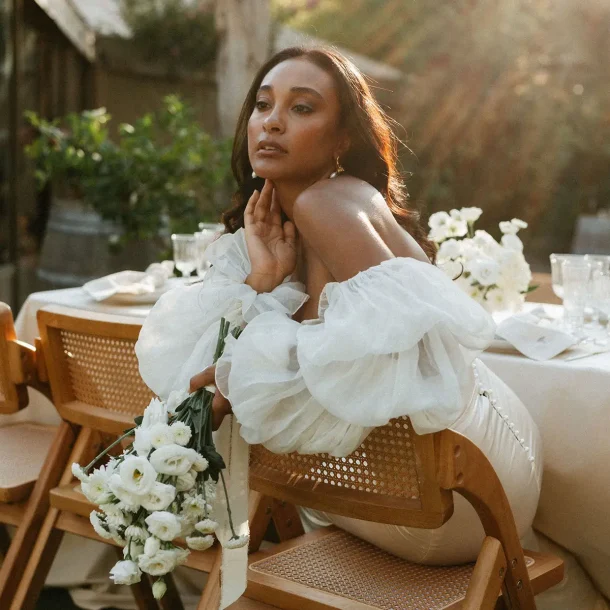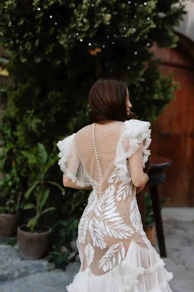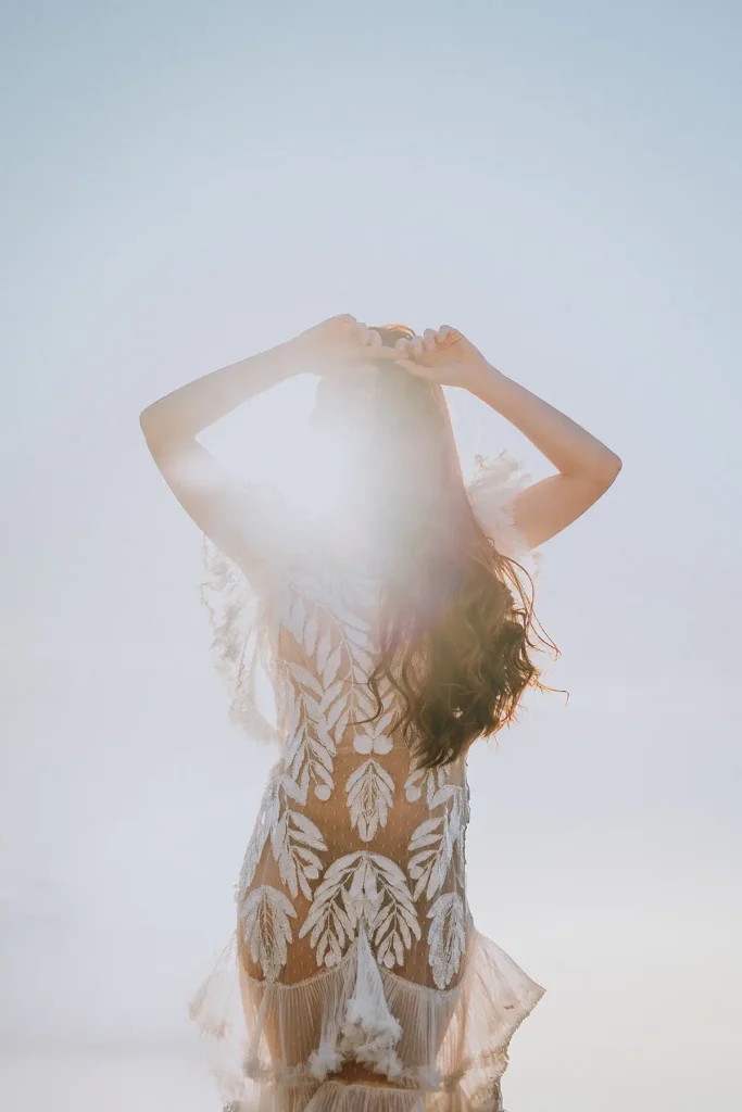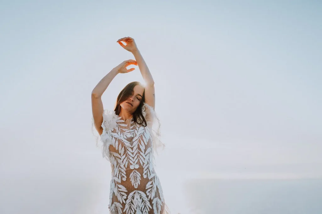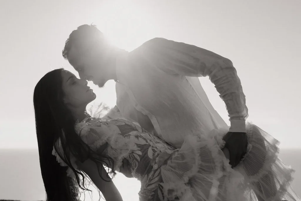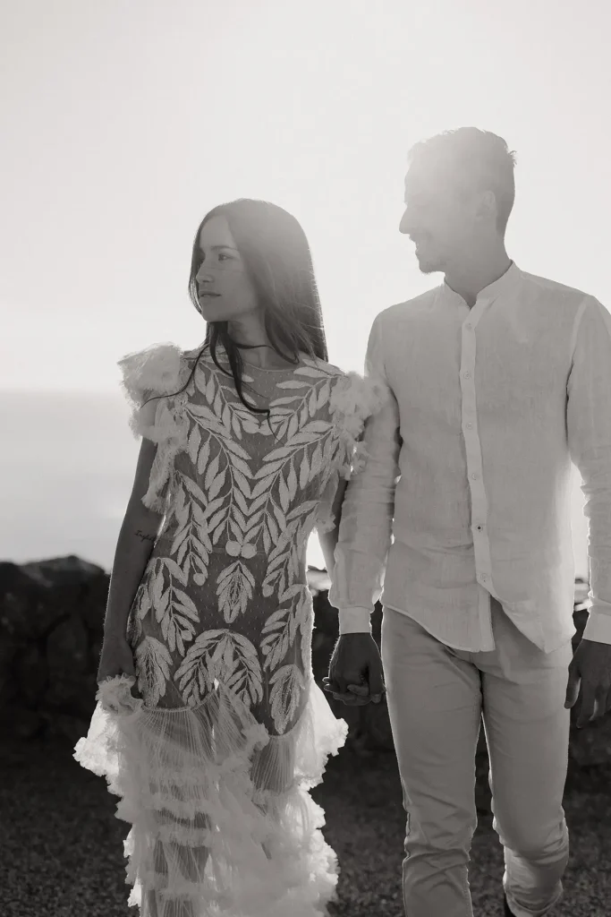 Mes grands-parents étaient de Palma, à Majorque. C’est peut-être ce qui a influencé mon amour pour cette île méditerranéenne si solaire. Mais si la plupart des touristes s’orientent vers la côte Est, rien n’a d’égal à mon sens que la côte ouest sauvage et préservée. Pour ce shooting inspiration mariage à Majorque, j’ai choisi de mettre en avant les paysages sauvages de la Serra de la Tramuntana. Ce littoral est baigné d’une lumière méditerranéenne intense et c’est ce que j’ai délibérément utilisé pour créer des photos pleines de vie et de moments hors du temps. Pour cette inspiration mariage, Alma Réal a crée une robe fortement inspirée de l’esthétique espagnole tout en jouant sur la transparence et la légèreté des volumes et des matières.