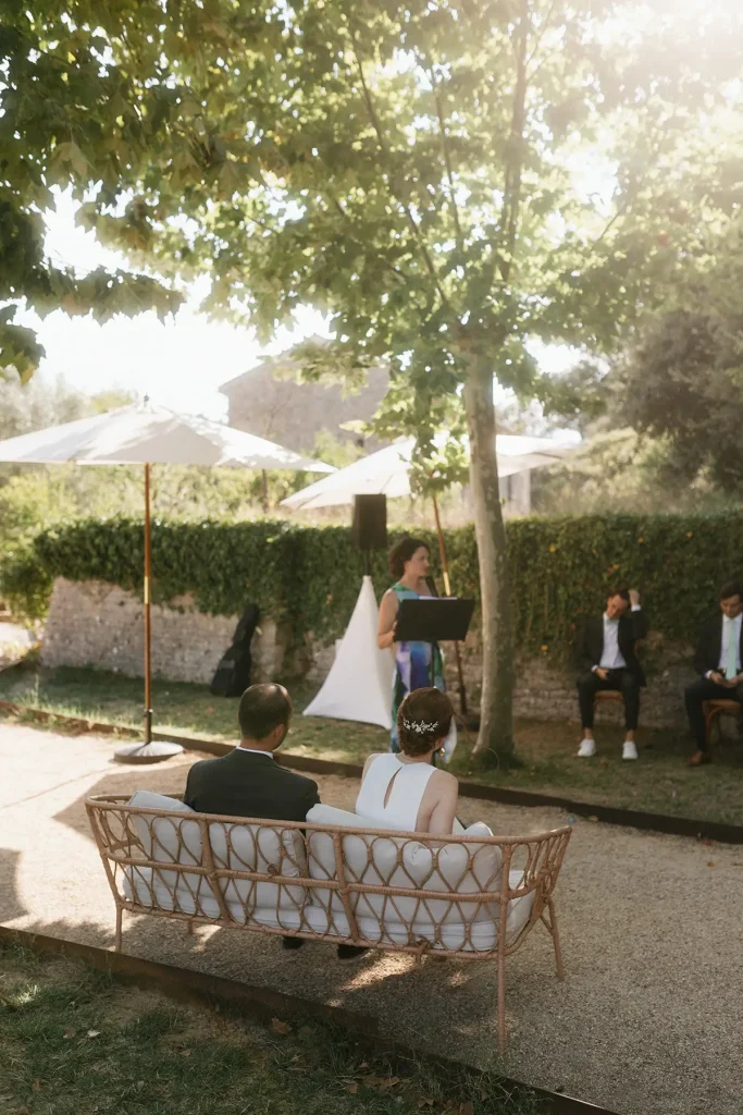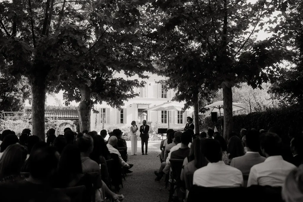 J’avais déjà eu la chance il y a quelques années de photographier un mariage au domaine de la cascade d’argens, un lieu que j’apprécie beaucoup dans le Centre-Var, à deux pas de chez moi. C’est un domaine très nature, avec une magnifique maison de maitre et de nombreux hébergements. De plus, il a l’énorme privilège d’être traversé par la rivière Argens qui traverse le domaine pour apporter fraicheur et sérénité en plein été. Il y a même la possibilité d’organiser sa cérémonie laïque les pieds dans l’eau (ou presque) mais gare aux moustiques ! Pour ce mariage Domaine de la Cascade d’Argens, les mariés avaient opté pour une cérémonie organisée sous les grands platanes du domaine.