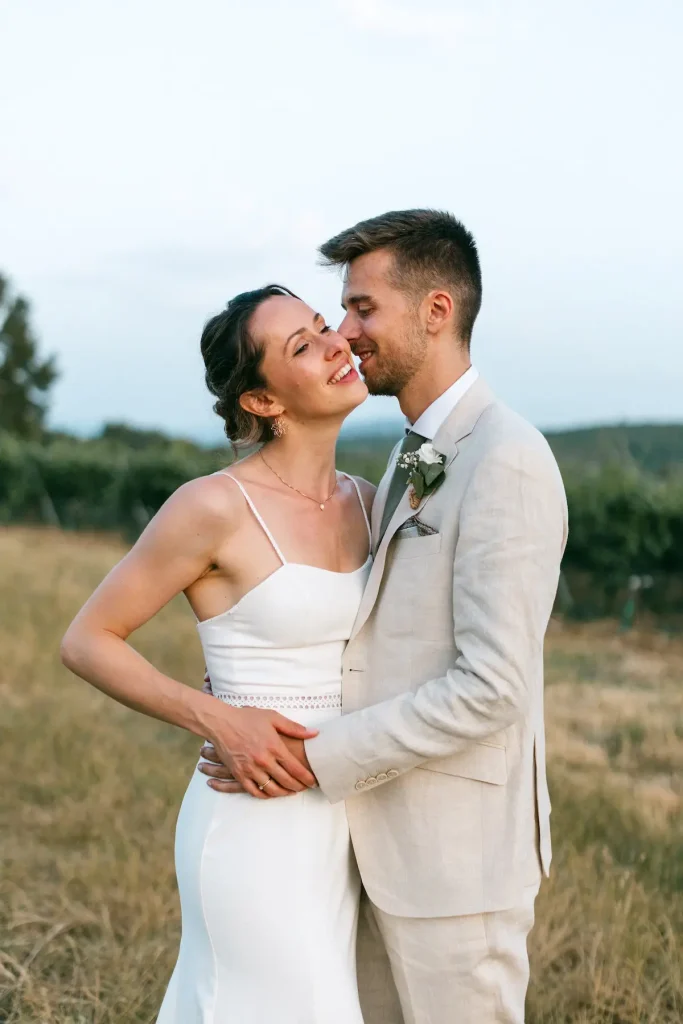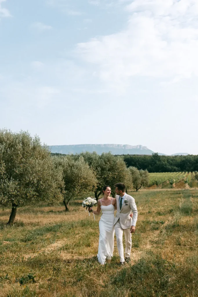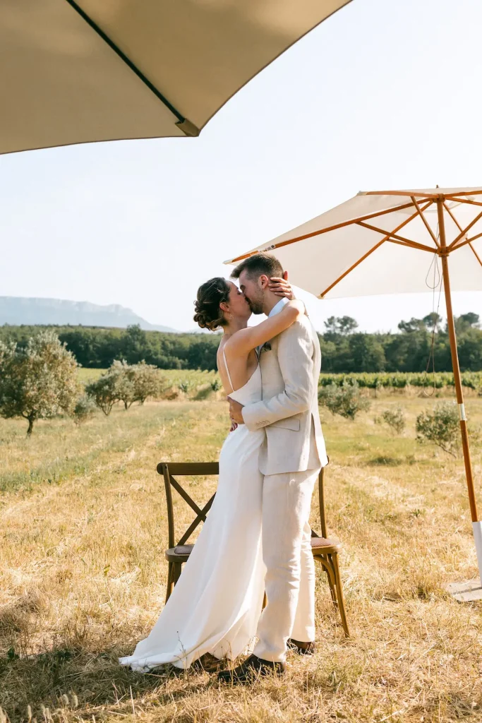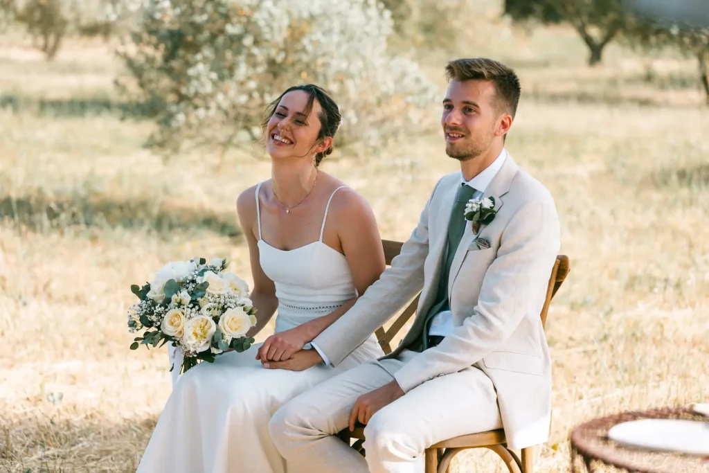 Ce couple a choisit de célébrer son union dans un champs d’oliviers, en plein mois de juin, au cours d’une cérémonie laïque. Ils se sont dit oui avec une vue dégagée les monts auréliens, dans une ambiance simple, conviviale et joyeuse. Nous avons ensuite célébré le cocktail dans la cour ombragée du domaine avant de poursuivre un repas en extérieur, dans la douceur des soirées du mois de juin. Le domaine de Saint Hilaire propose également d’autres espaces de réception sur le même site, et je serais ravie d’accompagner d’autres mariés dans ce domaine à deux pas de chez moi