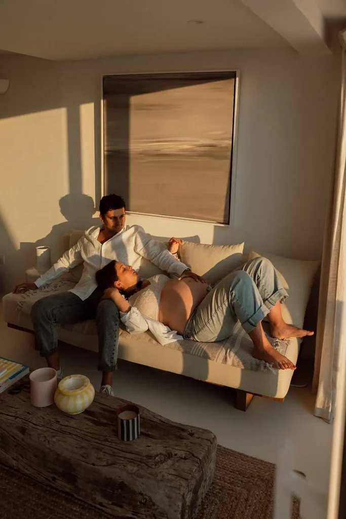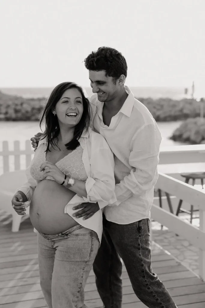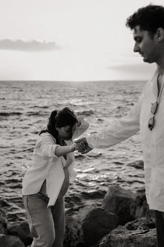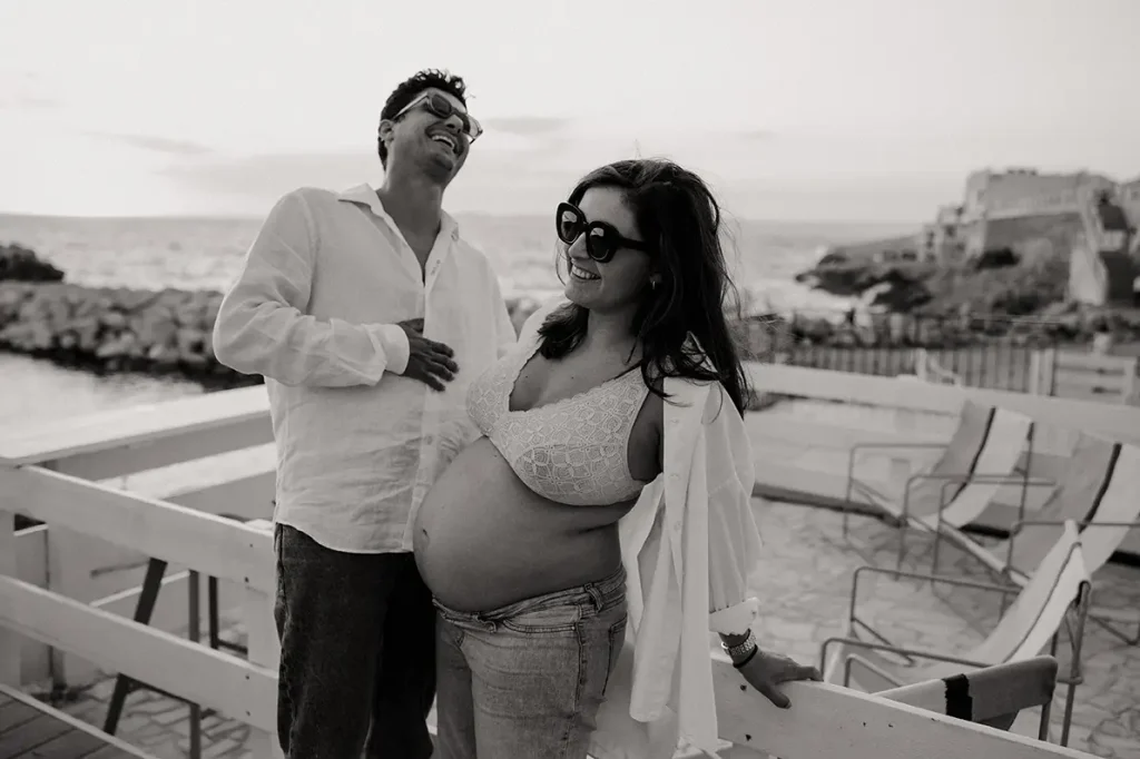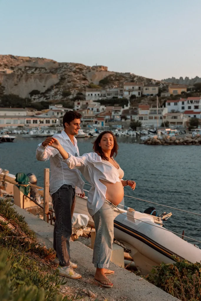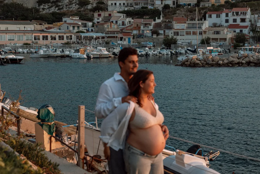 Surtout, cette séance bébé aux Goudes était finalement assez originale puisque la soeur de cette jeune maman était elle aussi enceinte ! Je leur ai donc proposé de réaliser un shooting famille croisé, avec les deux couples, ainsi que des photos avec les deux soeurs. Je pense que c’est aussi ça, le métier de photographe de famille à Marseille : vous permettre de garder des souvenirs des moments les plus importants de votre vie, de façon esthétique. Une séance bébé simple et naturelle peut se faire partout, en extérieur comme à la maison. Si en plus nous avons la chance d’avoir une magnifique lumière au coucher du soleil, face à la mer, c’est le combo gagnant !