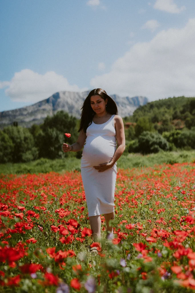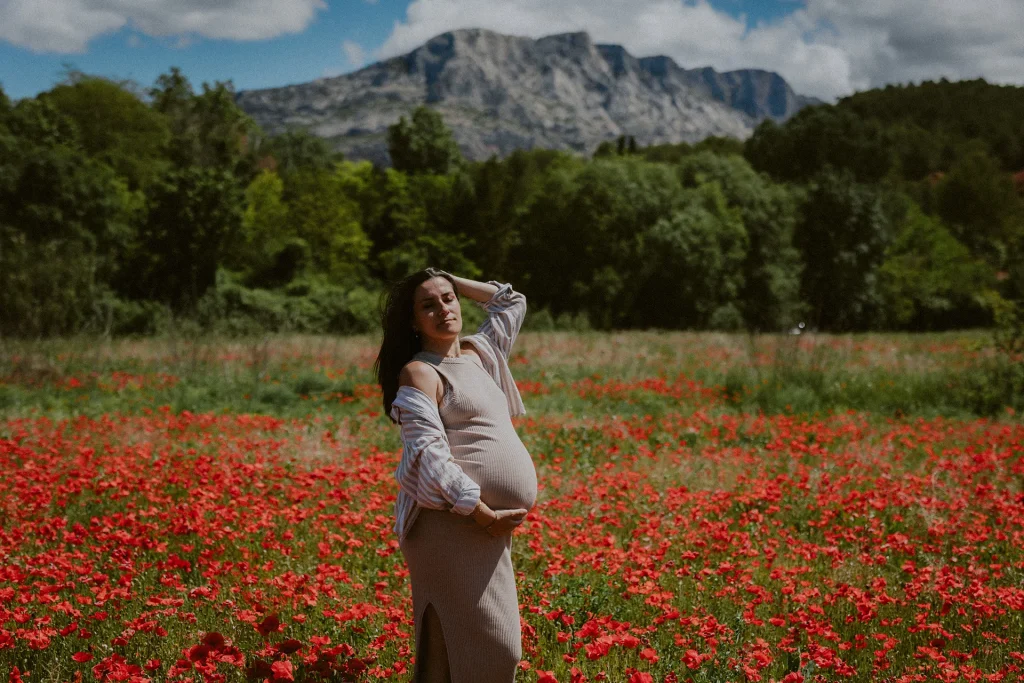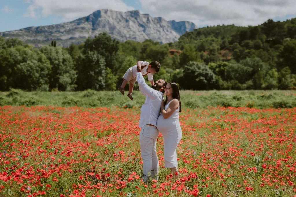 Un champs de coquelicots, c’est un décor rare et éphémère en Provence. Chaque année, les champs changent d’emplacements. En tant que photographe de famille en Provence, il faut prévoir des heurs de routes pour faire le tour de nos spots préférés à la recherche du lieu idéal à vous proposer pour votre séance photo maternité dans les coquelicots Cette année-là, j’ai eu de la chance : ce champs était un véritable tableau, avec la Sainte-Victoire en toile de fond ! Un symbole fort du paysage aixois, qui laisse peu de monde de marbre. Pour cette séance, j’ai retrouvé cette famille au mois de juin (la floraison change chaque année, parfois dès avril/mai, parfois plus tard). Si vous vous souvenez bien, je les avais retrouvé un an auparavant pour une séance photo dans un champs d’iris !